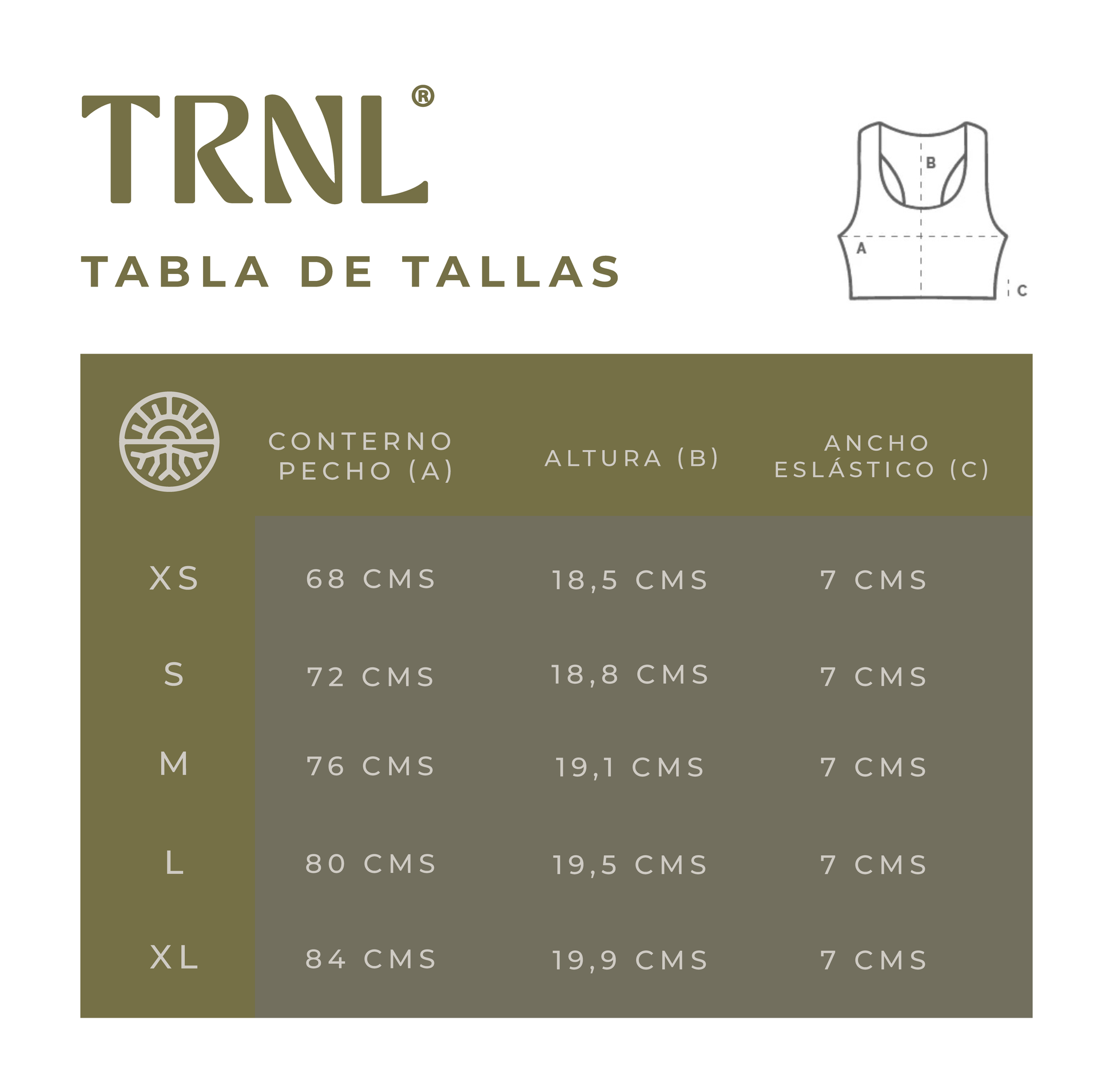 TOP RANO KAU Características: Sujeción alta, banda perimetral, escote redondo y espalda entretejida.